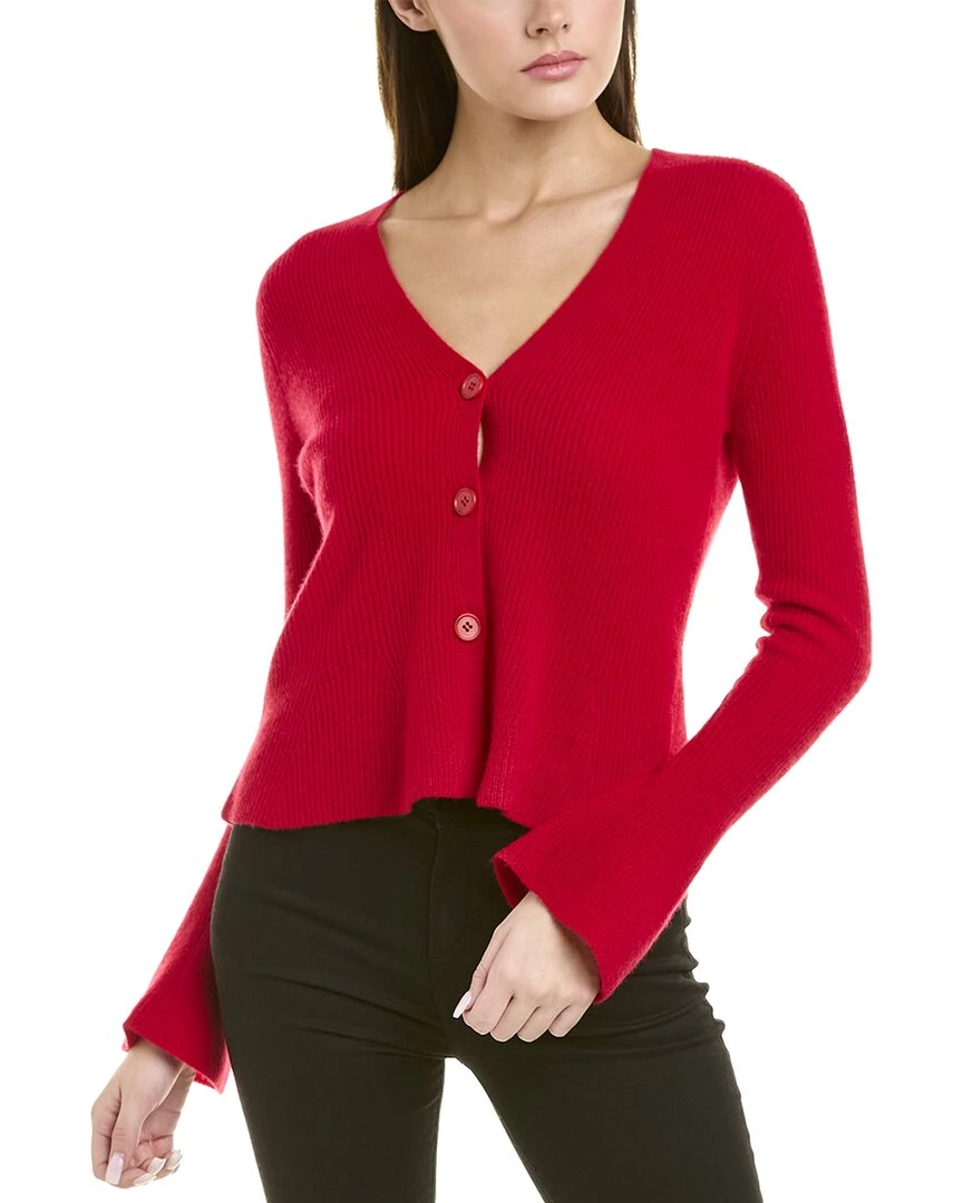 - Flare Cuff Cashmere Cardigan In Ruby With V-Neck