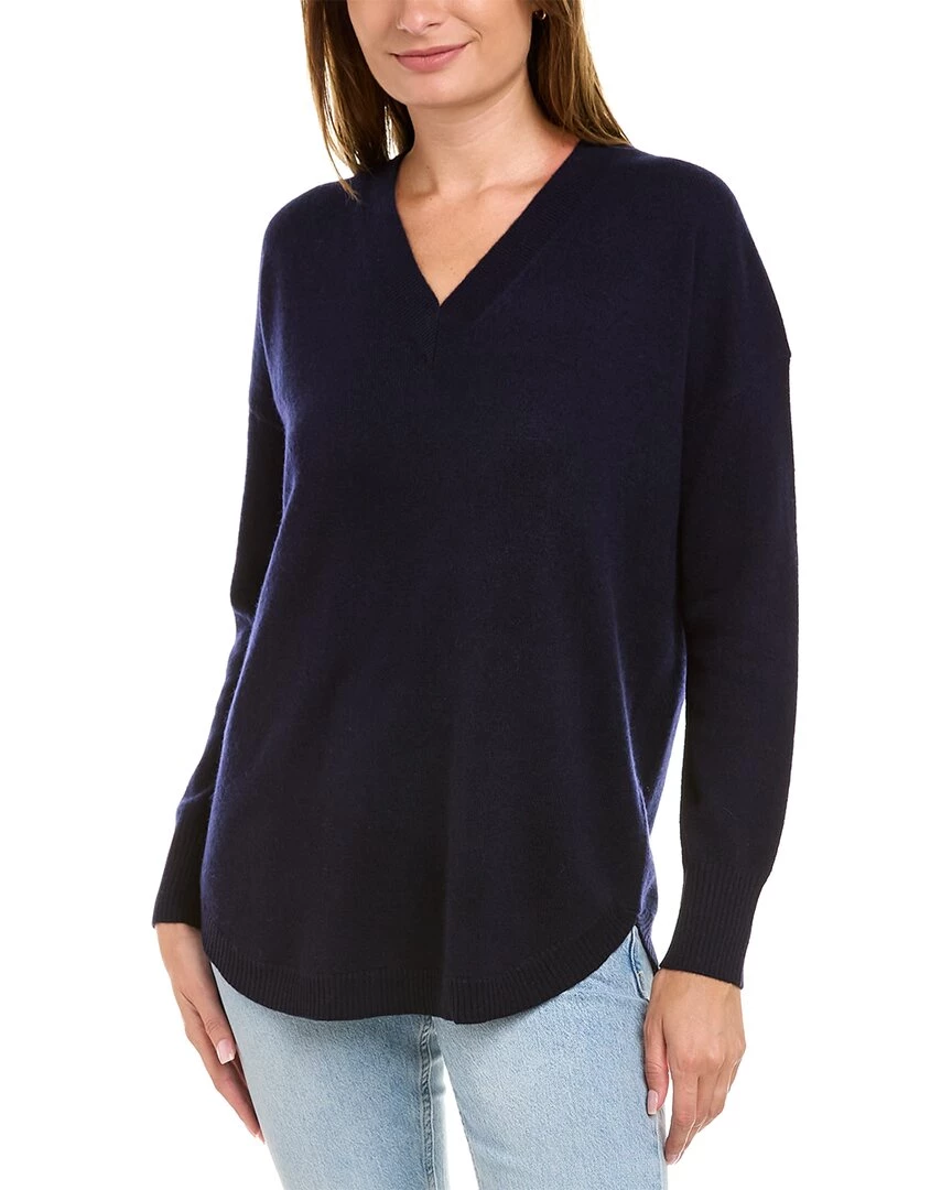 - V-Neck Cashmere Tunic Sweater In Navy With Dropped-Shoulder Sleeves, Curved Hem, And Ribbed Trim